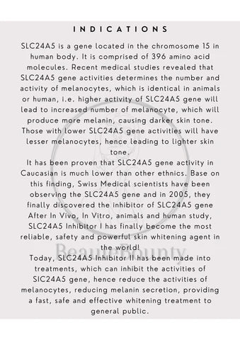 Clinical study revealed that SLC24A5 Inhibitor II can suppress the acitivities of of SLC24A5 gene, by disabling this gene, chemical pathways of melanin producing hormones, e.g. tyrosinase, NCKX5...etc, making the skin become fairer. Under the control of patented technology, SLC24A5 Inhibitor II will only act on melanocyte in the skin without affecting other pigmented cells in the hairs and eyes. Hence treatment of SLC24A5 Inhibitor II will not lead to albinism, but will achieve superb whitening efficacies. This product has been proven clinically to be effective in dark skin tone, pigmentation, uneven skin tone...etc.