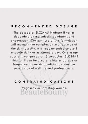 The dosage of SLC24A5 Inhibitor II varies depending on individual's conditions and expectation. Constant use of this formulation will maintain the complexion and radiance of the skin. Usually, it is recommended to use 1 ampoule daily or at alternate day. One usage course is comprised of 18 ampoules. SLC24A5 Inhibitor II can be used at a higher dosage or frequency in certain conditions, under the supervision of well trained professionals.