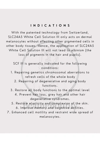SLC24A5 Inhibitor III or SCF III can be applied directly, or mix with saline solution (approx. 100 ml), 15 - 30 minutes therapy for enhancing effectiveness. Dosage of SLC24A5 White Cell Solution III + SCF III varies depending on individual and expectation.