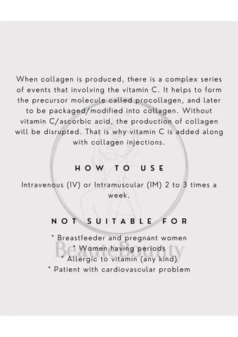 When collagen is produced, there is a complex series of events that involving the vitamin C. It helps to form the precursor molecule called procollagen, and later to be packaged/modified into collagen. Without vitamin C/ascorbic acid, the production of collagen will be disrupted. That is why vitamin C is added along with collagen injections.