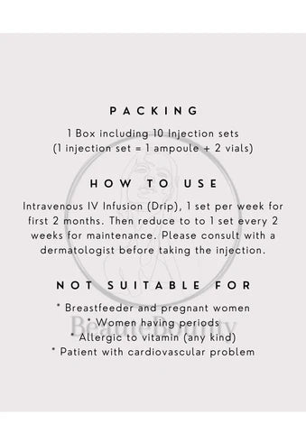 Intravenous IV Infusion (Drip), 1 set per week for first 2 months. Then reduce to to 1 set every 2 weeks for maintenance. Please consult with a dermatologist before taking the injection.