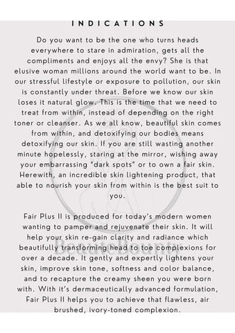 Fair Plus II is produced for today’s modern women wanting to pamper and rejuvenate their skin. It will help your skin re-gain clarity and radiance which beautifully transforming head to toe complexions for over a decade. It gently and expertly lightens your skin, improve skin tone, softness and color balance, and to recapture the creamy sheen you were born with. With it’s dermaceutically advanced formulation, Fair Plus II helps you to achieve that flawless, air-brushed, ivory-toned complexion.