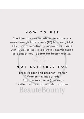 The injection can be administered once a week through Intravenous (IV) Infusion (Drip). Mix 1 set of injection (2 ampoules + 1 vial) with 100ml saline. It is always recommended to contact your doctor for better results.