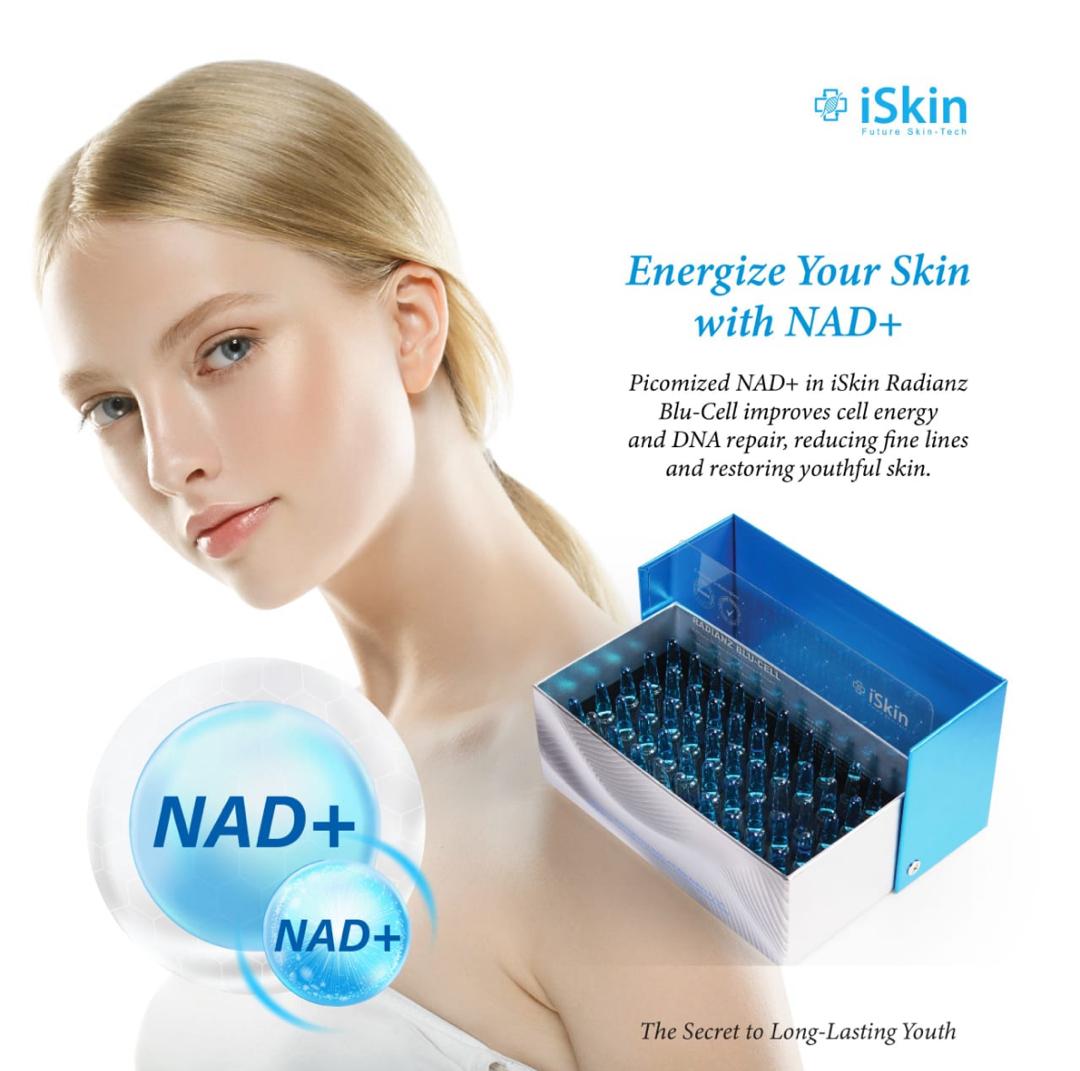 Picomized NAD+ in iSkin Radianz Blu-Cell improves cell energy and DNA repair, reducing fine lines and restoring youthful skin.