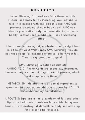 Japan Slimming Drip reduces fatty tissue in both visceral and body fat by increasing your metabolic rate. It is packed with anti-oxidants and AMC will promote balancing of your body's pH. AMC can detoxify your entire body, increase vitality, optimise bodily functions and in addition it has a whitening effect.