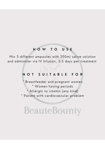 Mix 3 different ampoules with 200ml saline solution and administer via IV Infusion, 3-5 days per treatment.