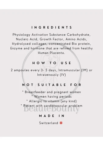 Physiology Activation Substance Carbohydrate, Nucleic Acid, Growth Factor, Amino Acids, Hydrolysed collagen, concentrated Bio protein, Enzyme and hormone that are refined from healthy Human Placenta.
