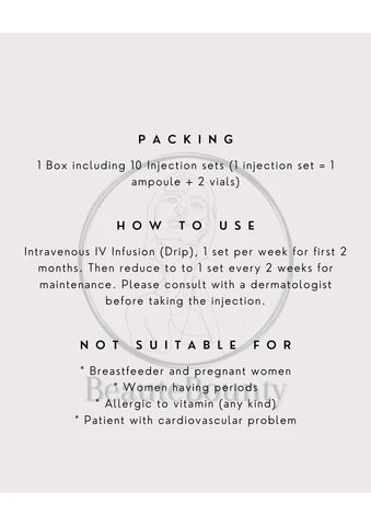Intravenous IV Infusion (Drip), 1 set per week for first 2 months. Then reduce to to 1 set every 2 weeks for maintenance. Please consult with a dermatologist before taking the injection.