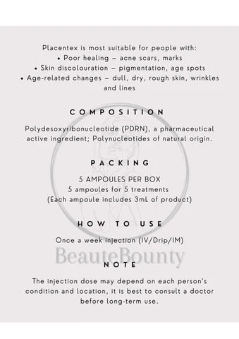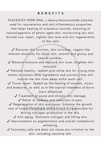 PLACENTEX PDRN DNA , a deoxyribonucleotide polymer used for rejuvenation and anti-inflammatory properties that helps healing of cutaneous wounds, boosting of neocollagenesis of photo aged skin, moisturizing dry skin, burned scar repair, lighten skin tone and skin regeneration of the cells