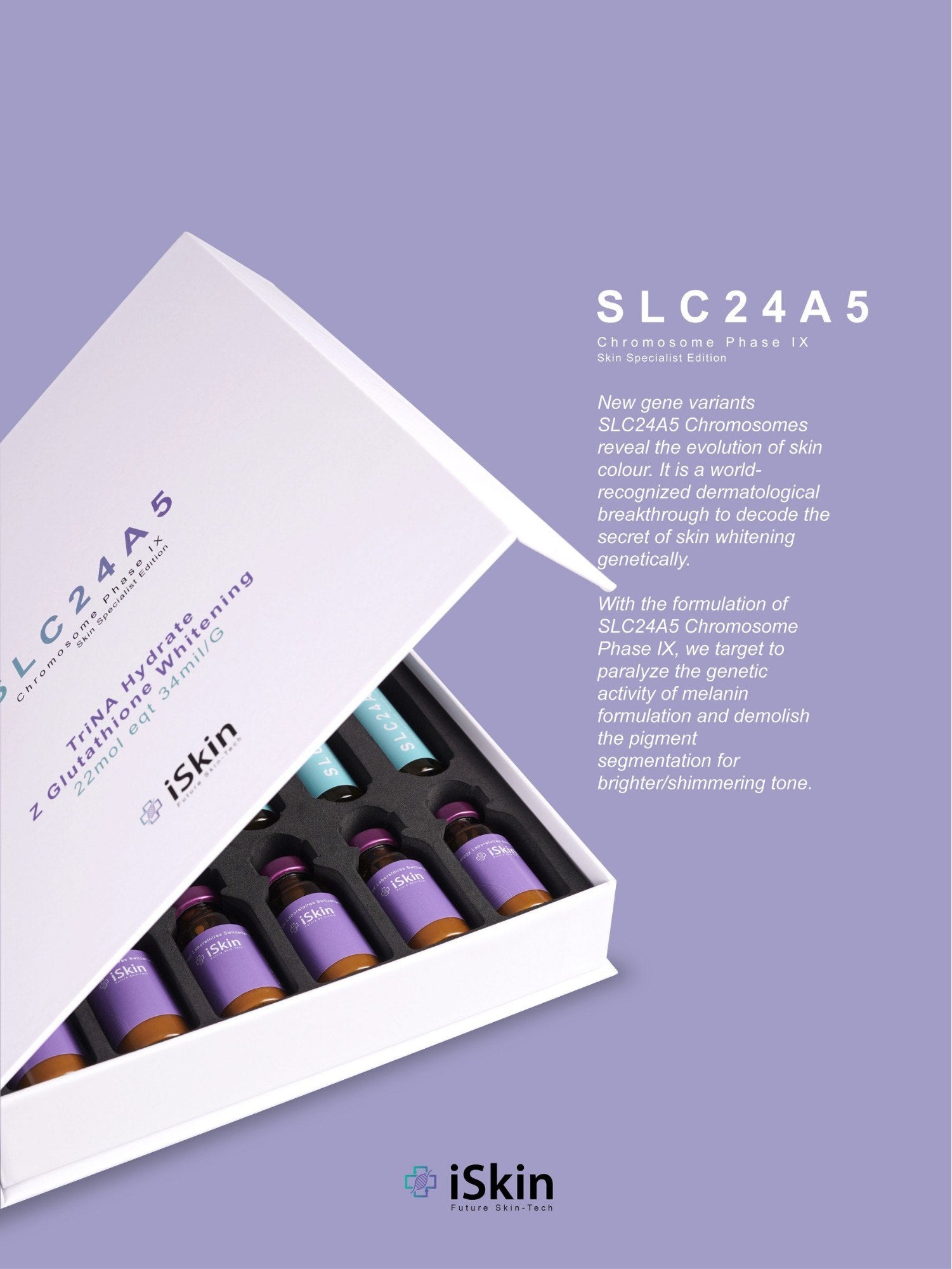 With all the invasive procedures, countless lotions and potions out there, isn't it time for a revolutionary explication that works? New gene variants SLC24A5 Chromosomes reveal the evolution of skin colour. It is world recognized dermatalogical breakthrough to decode the secret of skin whitening genetically. With the formulation of SLC24A5 Chromosome Phase IX, we target to paralyze the genetic activity of malanin formulation and demolish the pigment segmentation for brighter/shimmering tone.