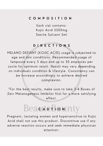 MELANO DEFIANT (KOJIC ACID) usage is subjected to age and skin conditions. Recommended usage of 1ampoule every 3 days and up to 30 ampoules per cycle for optimum result. Result may very depending on individuals condition & lifestyle. Consistency can be increase accordingly to achieve desired complexion.