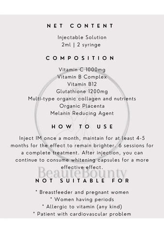 Inject IM once a month, maintain for at least 4-5 months for the effect to remain brighter. 6 sessions for a complete treatment. After injection, you can continue to consume whitening capsules for a more effective effect.