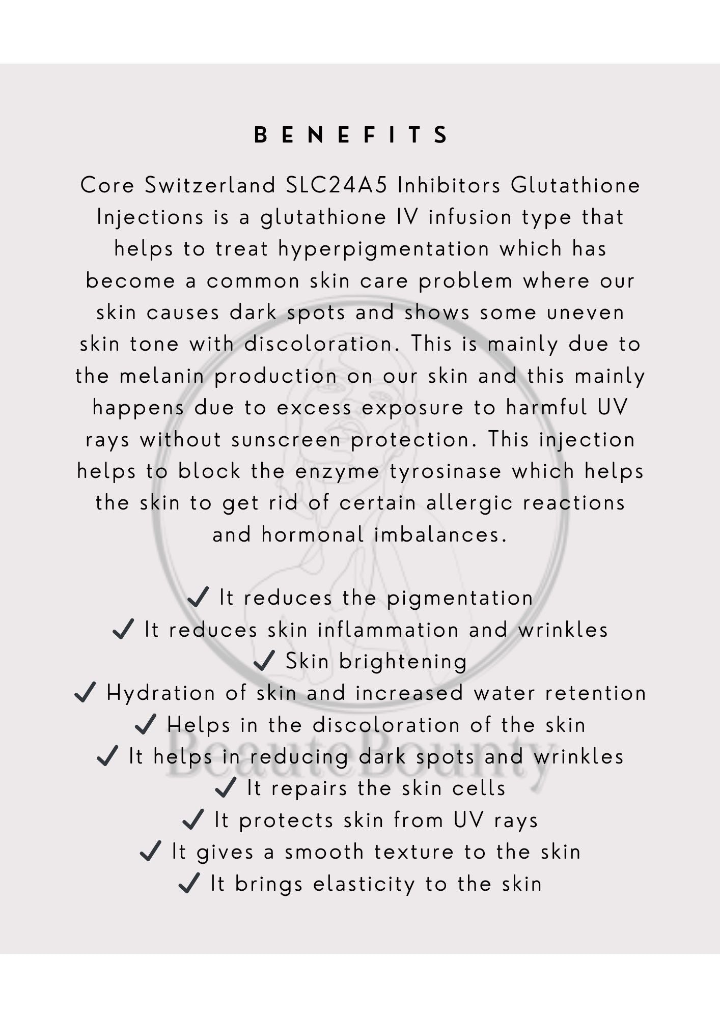 Core Switzerland SLC24A5 Inhibitors Glutathione Injections is a glutathione IV infusion type that helps to treat hyperpigmentation which has become a common skin care problem where our skin causes dark spots and shows some uneven skin tone with discoloration. This is mainly due to the melanin production on our skin and this mainly happens due to excess exposure to harmful UV rays without sunscreen protection. This injection helps to block the enzyme tyrosinase which helps the skin to get rid of certain allergic reactions and hormonal imbalances.