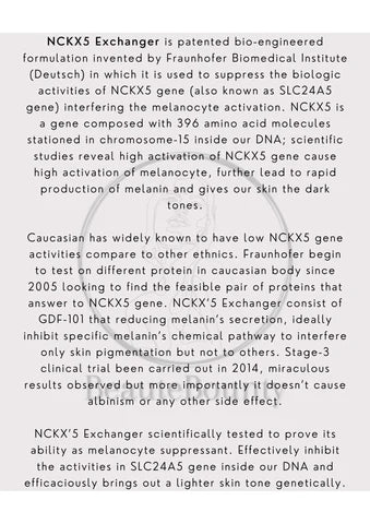 NCKX5 Exchanger is patented bio-engineered formulation invented by Fraunhofer Biomedical Institute (Deutsch) in which it is used to suppress the biologic activities of NCKX5 gene (also known as SLC24A5 gene) interfering the melanocyte activation. NCKX5 is a gene composed with 396 amino acid molecules stationed in chromosome-15 inside our DNA; scientific studies reveal high activation of NCKX5 gene cause high activation of melanocyte, further lead to rapid production of melanin and gives our skin the dark tones.