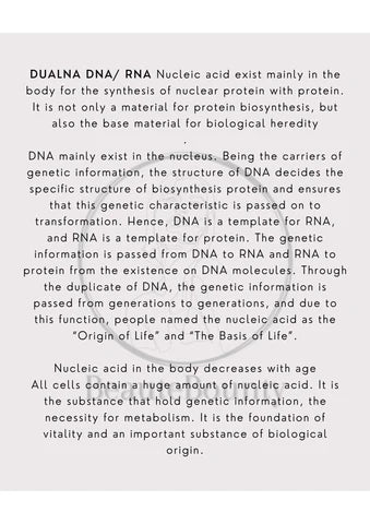 DUALNA DNA/ RNA Nucleic acid exist mainly in the body for the synthesis of nuclear protein with protein. It is not only a material for protein biosynthesis, but also the base material for biological heredity.