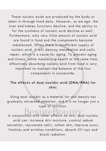 In conjunction with other effects on skin, dual nucleic acid can: increase skin moisture, control sebum secretion, rejuvenate cells, soften skin, improve scars, freckles and wrinkles conditions, absorb UV rays and block radiation.