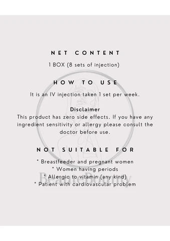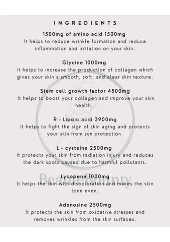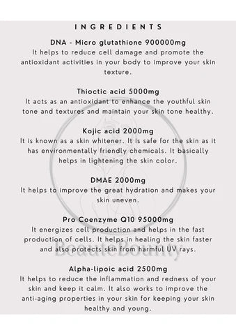- DNA - Micro glutathione 900000mg-: It helps to reduce cell damage and promote the antioxidant activities in your body to improve your skin texture.