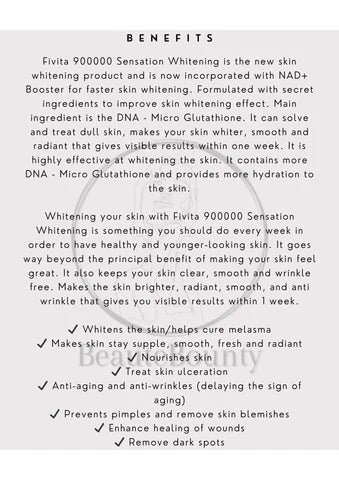 Fivita 900000 Sensation Whitening is the new skin whitening product and is now incorporated with NAD+ Booster for faster skin whitening. Formulated with secret ingredients to improve skin whitening effect. Main ingredient is the DNA - Micro Glutathione. It can solve and treat dull skin, makes your skin whiter, smooth and radiant that gives visible results within one week. It is highly effective at whitening the skin. It contains more DNA - Micro Glutathione and provides more hydration to the skin.