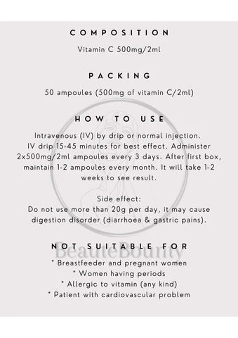 Ingredients: High concentrated of Gluthathione, Vitamin C, Vitamin B (and its group), L-cysteine and others.