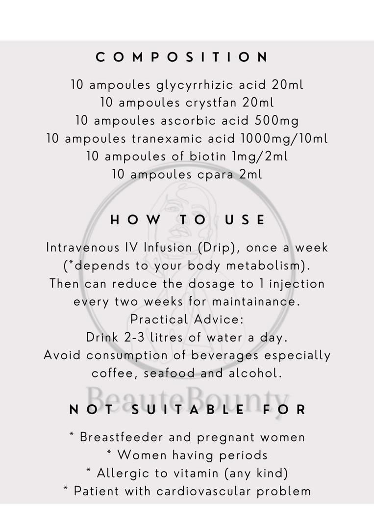 Intravenous IV Infusion (Drip), once a week (*depends on your body metabolism). Then can reduce the dosage to 1 injection every two weeks for maintainance.