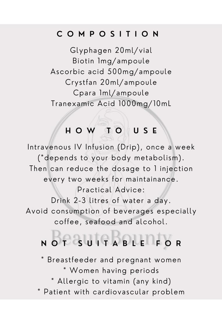 Intravenous IV Infusion (Drip), once a week (*depends on your body metabolism). Then can reduce the dosage to 1 injection every two weeks for maintainance.
